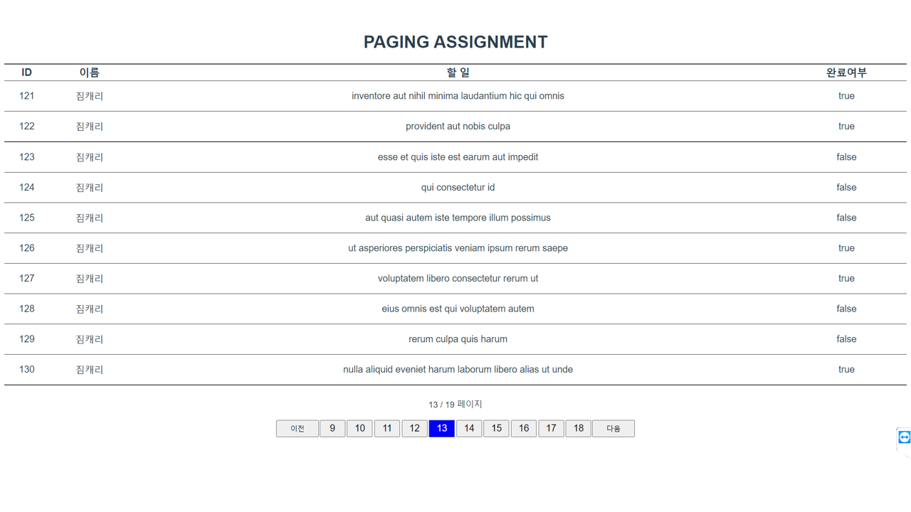 참고한 블로그: https://pewww.tistory.com/5 Vue.js로 간단한 페이징 구현 안녕하세요! 오늘은 Vue.js로 간단한 페이징을 구현해보려합니다~ 되게 간단하게 할 수 있지만, 저는 vue-cli를 이용하여 구현하겠습니다. 설정이 기억나지 않으시는 분들은 이 글을 참고해주세 pewww.tistory.com vue-cli를 통해 구현하였습니다. API 데이터는 https://jsonplaceholder.typicode.com/todos 해당 사이트에서 가져왔습니다. 코드 실행 결과) PAGING ASSIGNMENT App.vue 컴포넌트입니다. 특별한 건 없고 PaginatedList를 하위 컴포넌트로 연결했습니다. ID 이름 할 일 완료여부 {{ p.id }} {{ p.userId ..